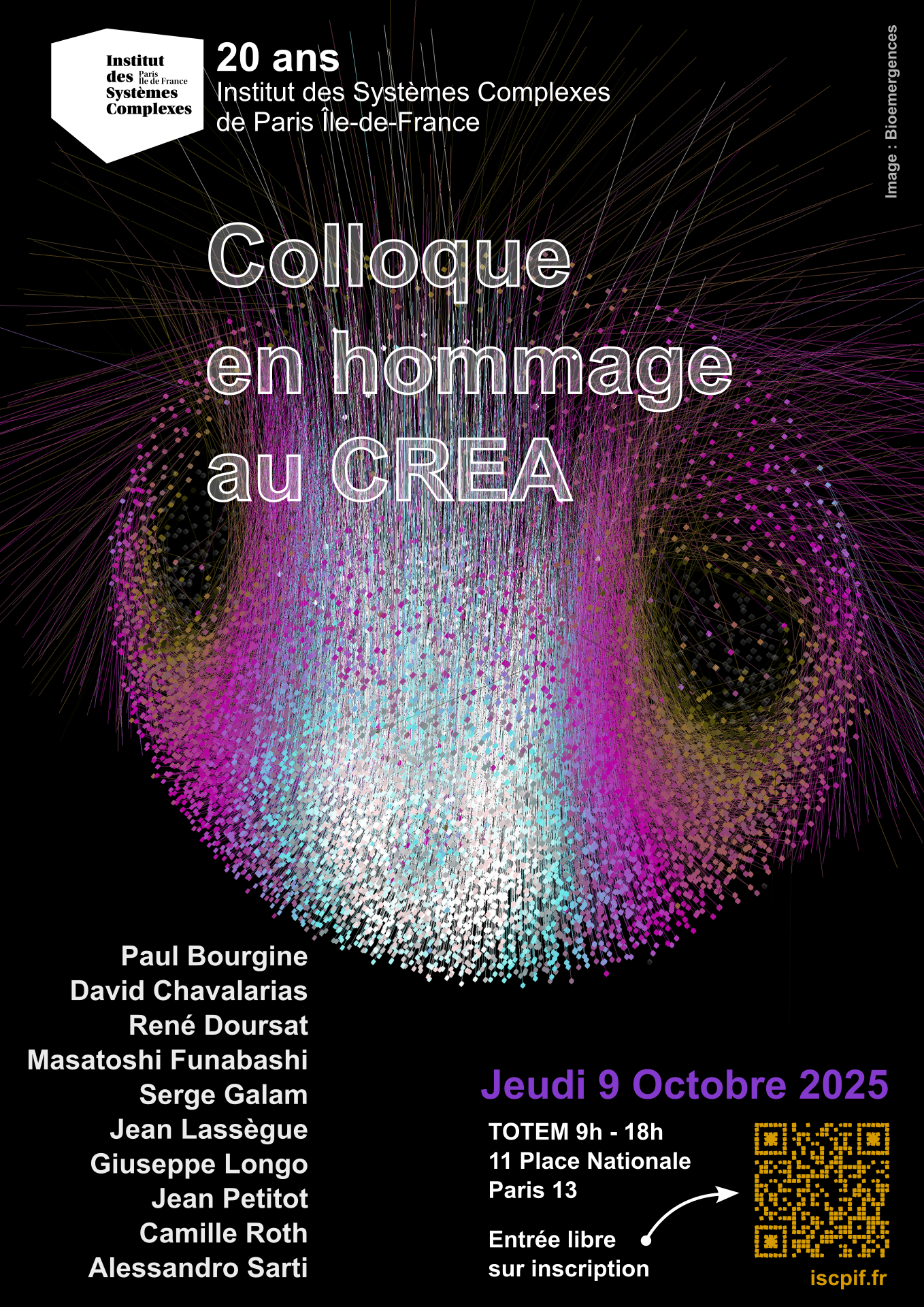 - 11h00 Paul Bourgine (UNESCO UniTwin CS-DC, ancien directeur du CREA 2006-2010, fondateur et directeur de l’ISC-PIF 2005-2009) Systèmes Complexes et triangle épistémologique