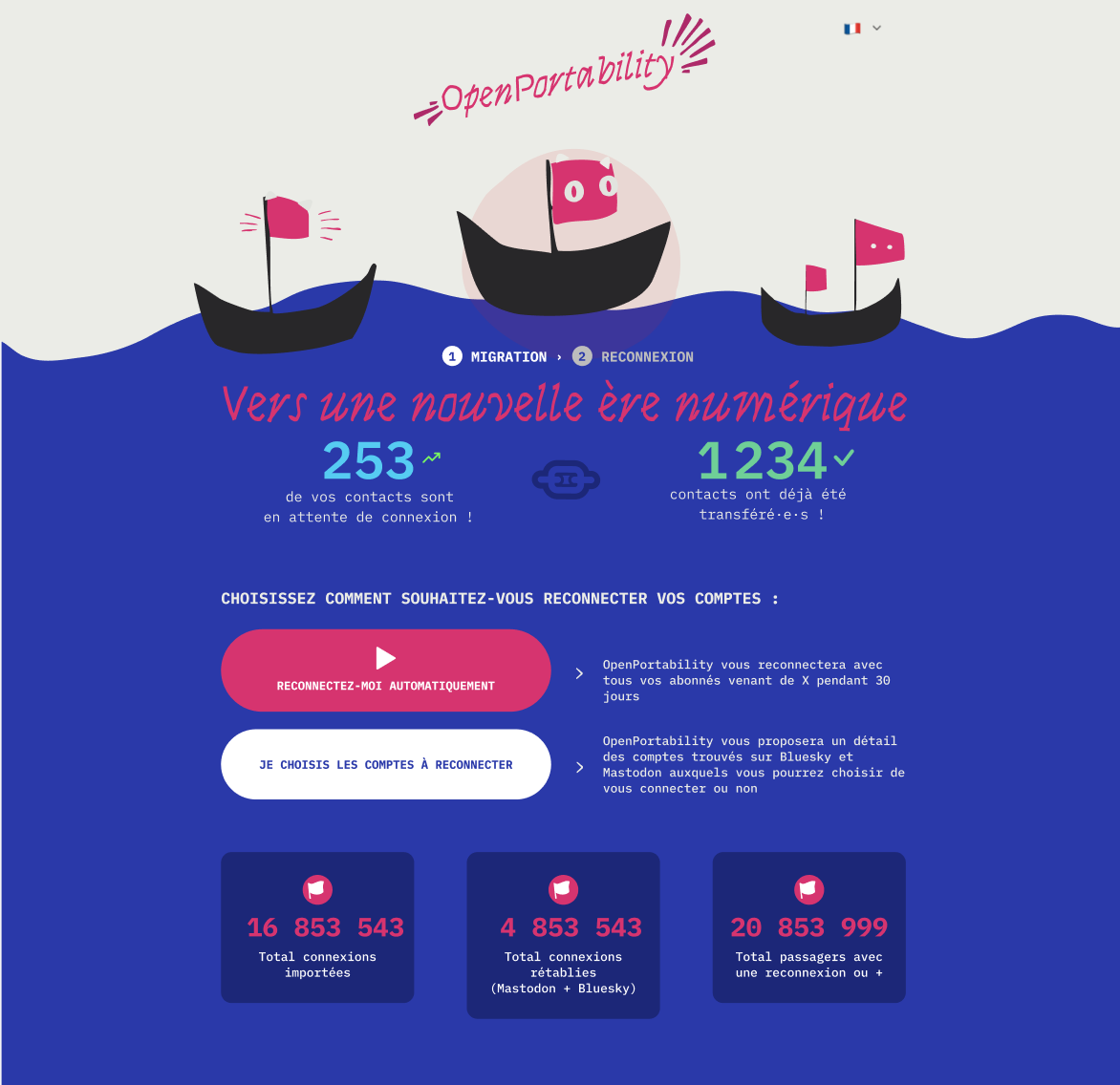 The aim of the OpenPortability platform is to map the network of interactions between X users who wish to invest in new digital spaces. This mapping is used on the one hand for research, and on the other to offer users the possibility of easily reconnecting with followers and followees within the Mastodon and BlueSky environments.