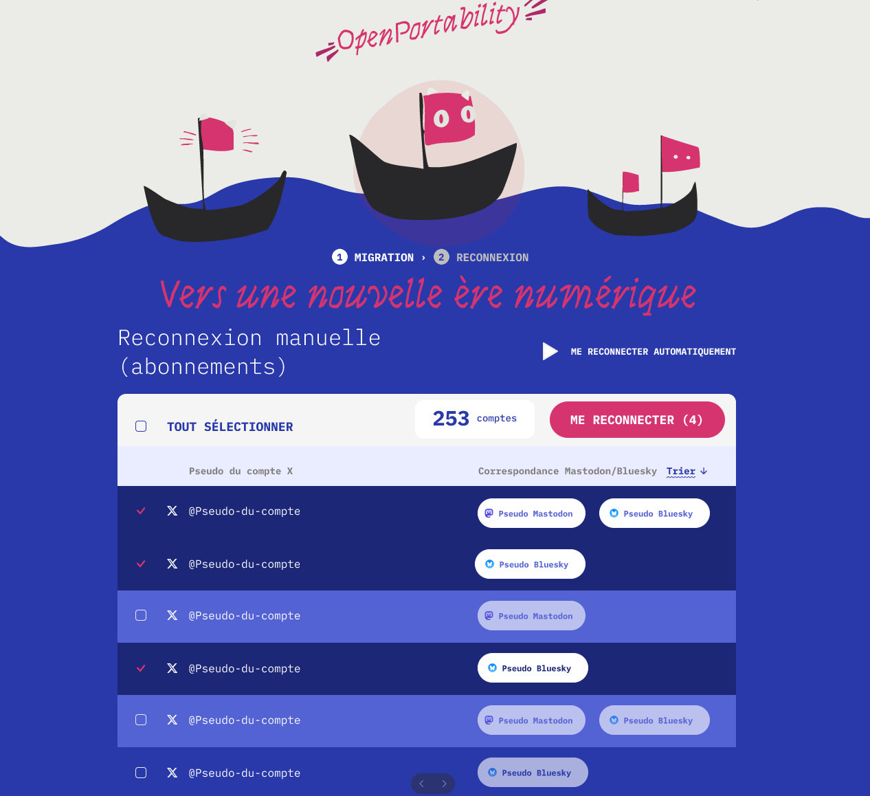 The final step is to authorize OpenPortability to reconnect you with the same people you are connected on X. To do this, a time-limited authorization token is generated by your BlueSky or Mastodon accounts and used by OpenPortability to carry out reconnections. Two modes are available: individual choice of reconnections, or mass validation.