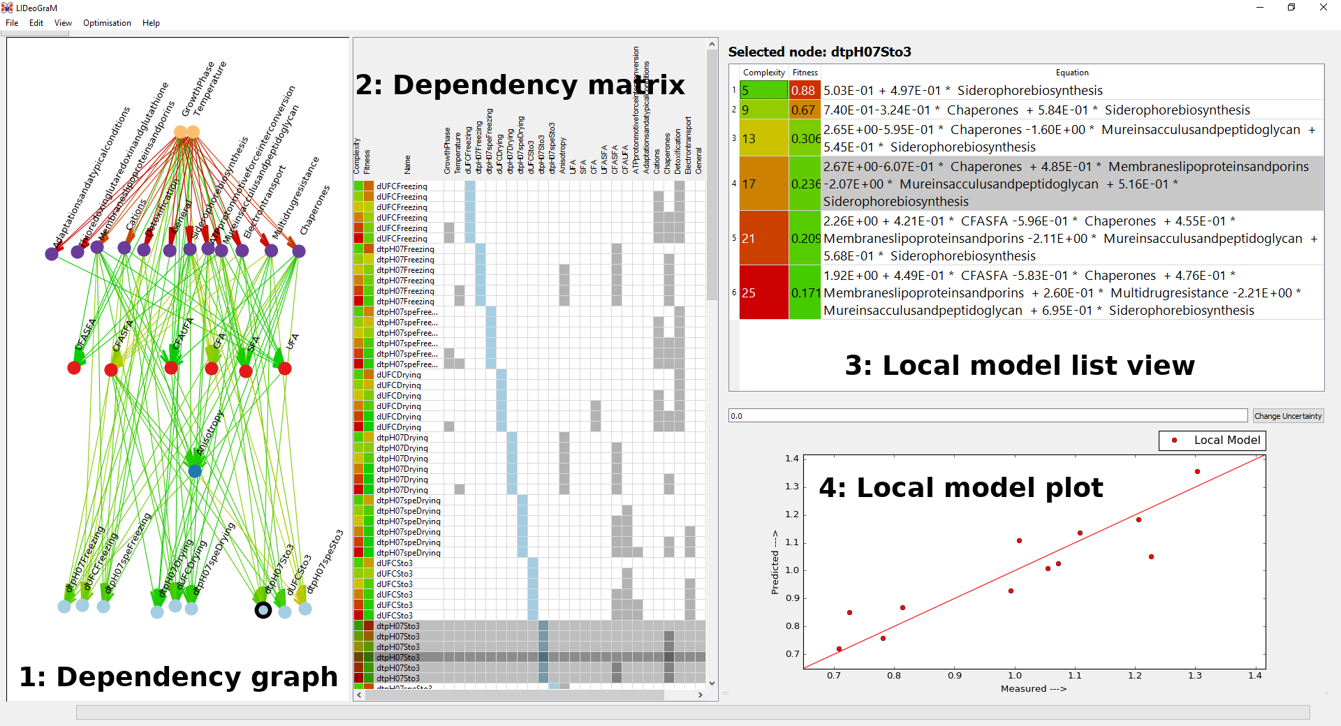 Apprentissage interactif pour explorer différentes représentations math/informatiques du système étudié : exemple de l’outil LIDeOGraM (Chabin, 2017) sur un jeu de données concernant l’affinage de camembert. Les experts du domaine créent interactivement un graphe de dépendances (1) à partir des données, les noeuds représentent les variables et les lien, des relations possibles entre variables. Une représentation matricielle (2) montre différents modèles “locaux” générés automatiquement par LIDeOGraM. Les lignes correspondent aux modèles locaux, les colonnes aux variables impliquées dans ces modèles. Quand un noeud est sélectionné (exemple “dtpH07Sto3”), une liste d’équations-modèles est proposée (3) et repérée simultanément sur la représentation matricielle (en gris moyen). Si un modèle local est sélectionné dans la liste (3), une courbe d’erreur de reconstruction est présentée (4).